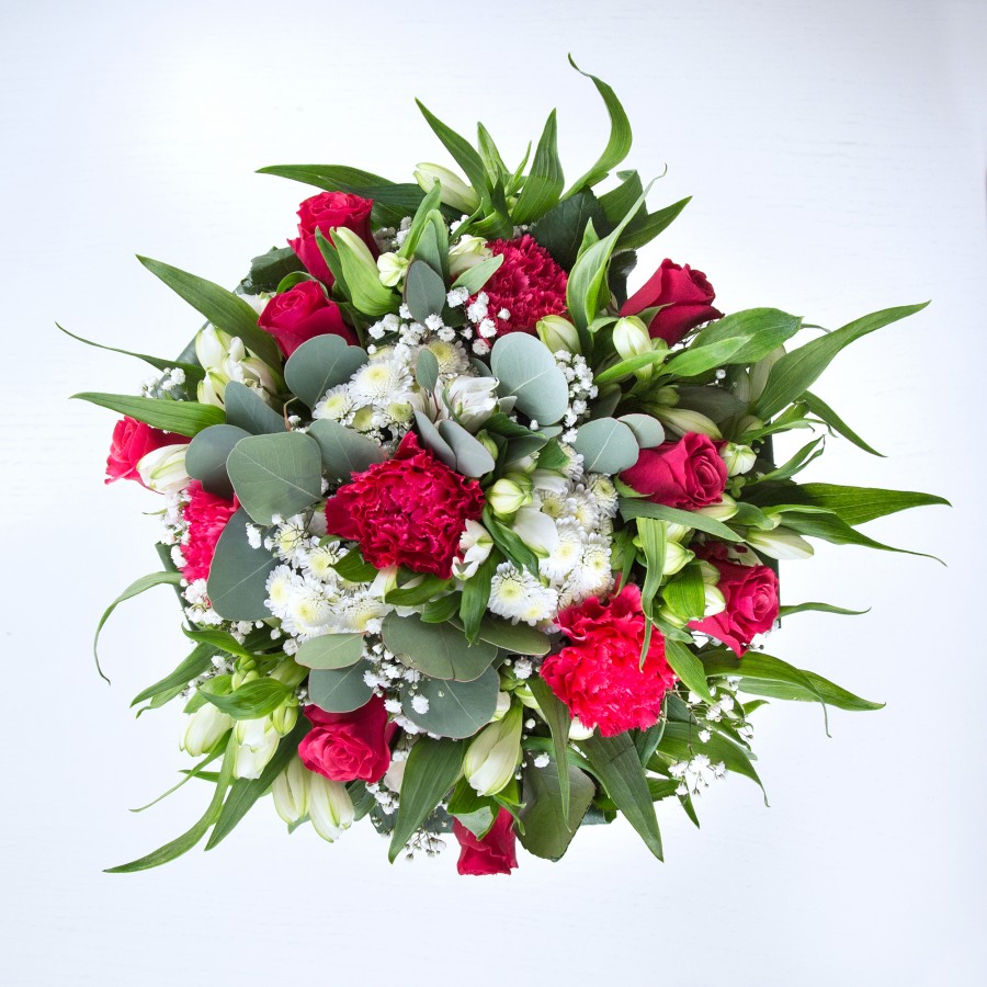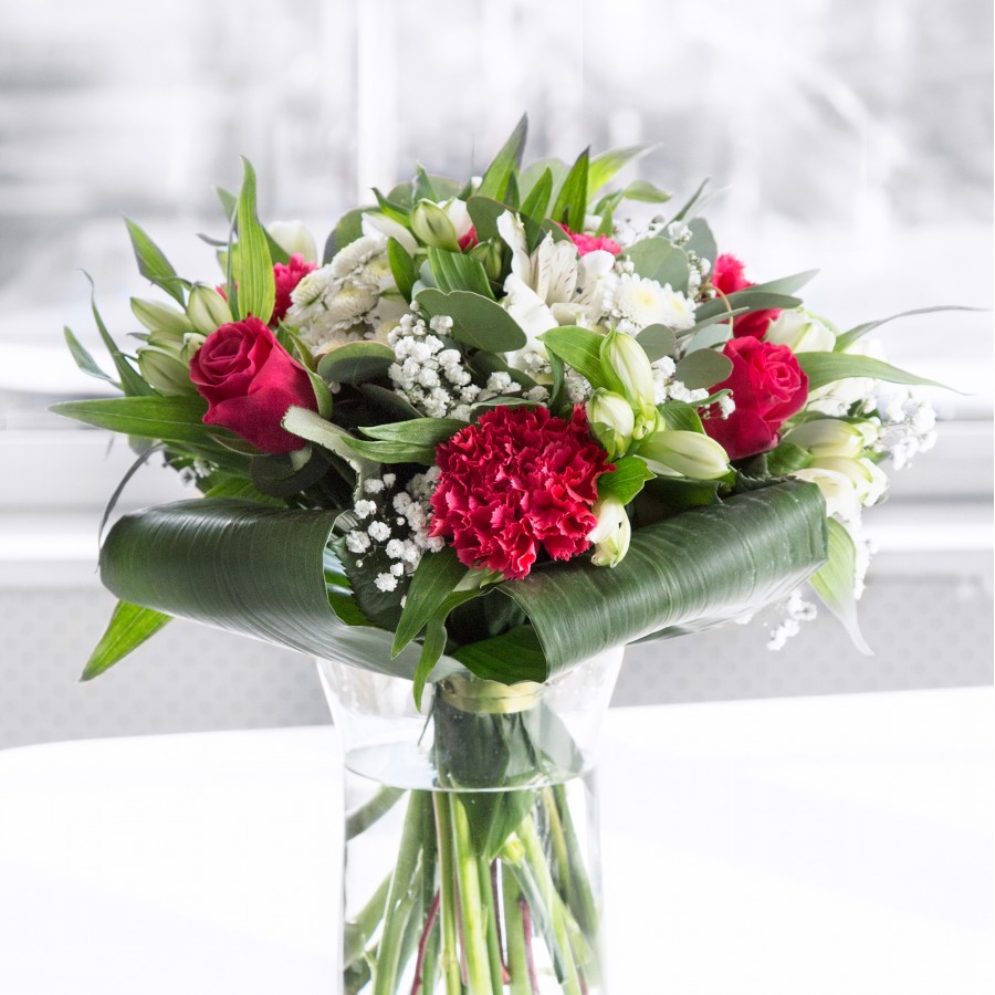The Pure Elegance Bouquet is a timeless arrangement that showcases the harmonious blend of white chrysanthemums, gypsophila, and red roses. Accented with white alstroemeria and aspidistra leaves, it exudes sophistication and charm.