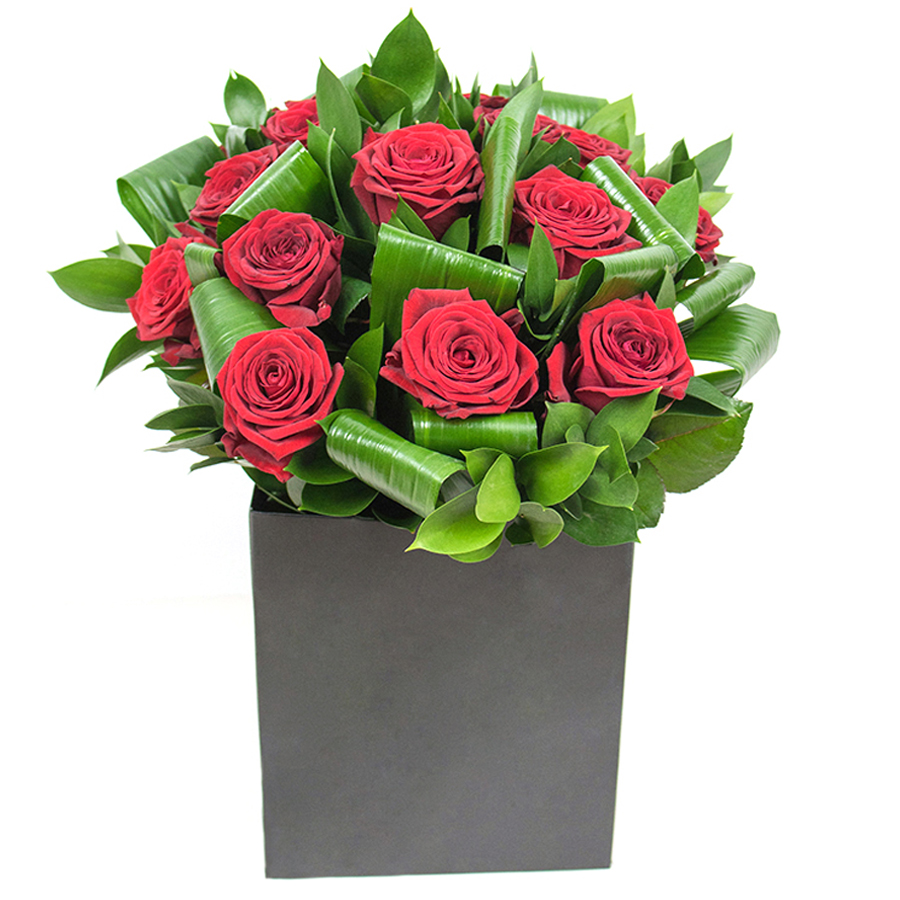 Discover the refined beauty of our bouquet, featuring deep red roses, rich aspidistra leaves, and graceful ruscus. This unique design adds elegance and charm to any home or office.
